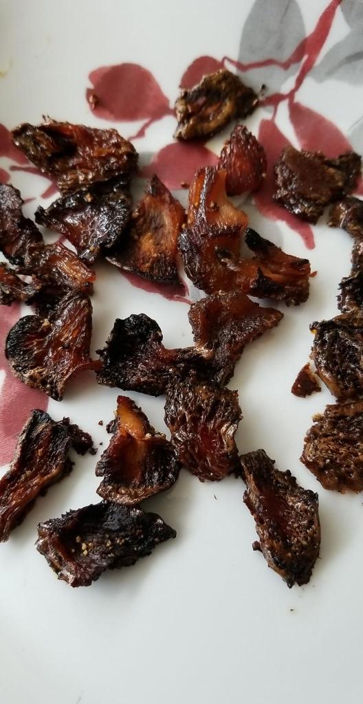 This particular experiment focused on preparation of the mushrooms in a similar fashion to bacon and then directly consuming — er, I mean test — the results for flavor.