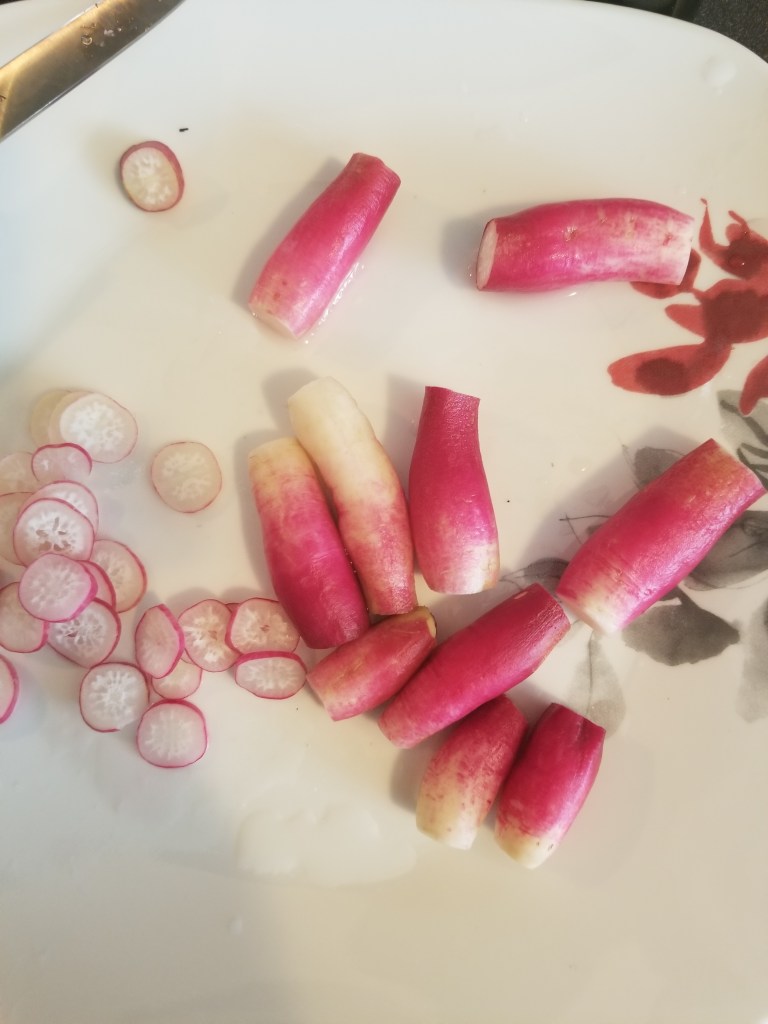 Yes, in fact, it was. I found this recipe online by Dandy, which requires the use of their proprietary “radish coins.” Well, didn’t have those, and thus I made do with the breakfast radishes acquired at the farmer’s market last Saturday.